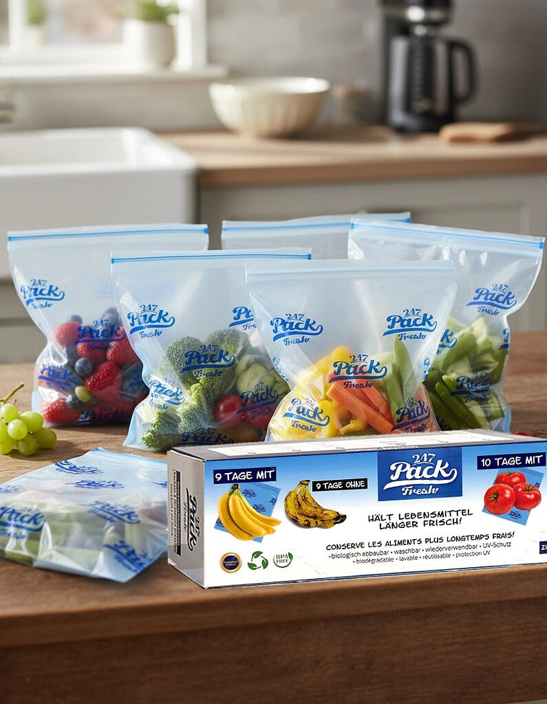 «Freshpack» sind umweltfreundliche Lebensmittelbeutel, welche Obst, Gemüse, Fleisch, Fisch oder Brot bis zu 3x länger frisch halten und somit zur Reduktion von Foodwaste beitragen.