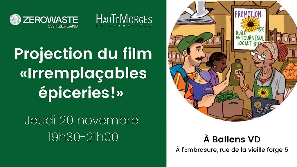 Les associations Hautemorges en transition et ZeroWaste Switzerland présentent le film « Irremplaçables épiceries ! » (47 minutes) réalisé par Jacques Mirenowicz, qui met en lumière le fonctionnement d’épiceries alternatives en Suisse romande.